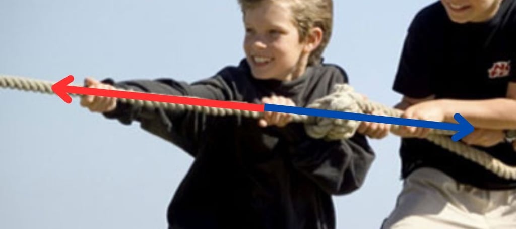 En la imagen del encabezado, la flecha roja es la dirección de la fuerza de resistencia y la azul es la fuerza de potencia, la fuerza que tienen que realizar los niños para vencer a la resistencia (roja). Creo que es un ejemplo claro para ver la dirección de la fuerza. Se trata de dos fuerzas que siempre tienen dirección contraria.