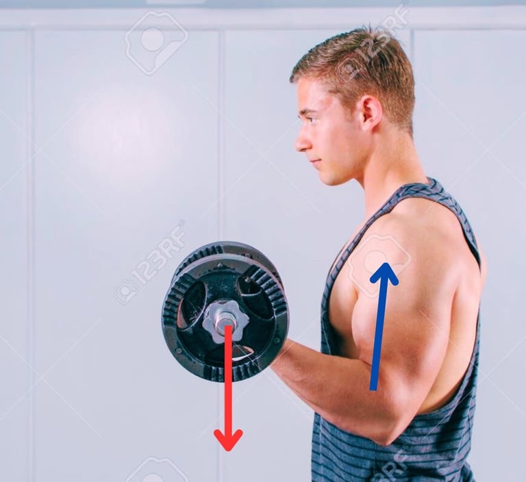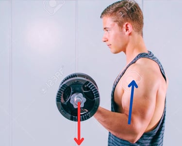 Por ejemplo, en el curl de biceps, la fuerza de la gravedad, una de las fuerzas mas importantes en el ejercicio, va hacia abajo (siempre tendrá esa dirección), sería la que provoque la resistencia. Hacia arriba es la fuerza de la potencia que realiza el biceps.