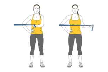 En esta imagen, la resistencia que provoca el elástico va en la dirección contrario del músculo rotador que queremos trabajar, en este caso el trabajo lo realizaría sobre todo el músculo infraespinoso. Si queremos trabajar el subescapular, la dirección de la resistencia y la potencia serían al revés.